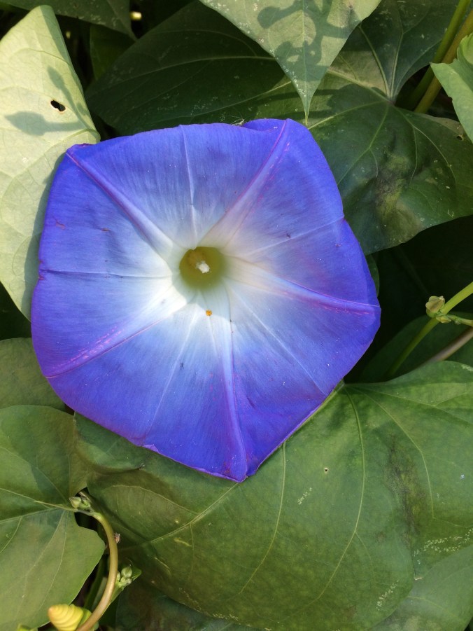 Back in the spring my older daughter and I planted morning glories and moon flowers on the south side of the deck, as we do every year. The vines grow up and over the railing until we can see them from the living room and kitchen. Planting both gives us flowers literally all day and night; in the morning and evening we get an added show as they all are still open, together.